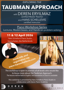 Led by Deren Eryilmaz, the only certified Taubman Master Teacher in Europe, together with Hans Schellevis, the only Dutch, Instructor-level certified Taubman Teacher, this workshop combines lectures, masterclasses, and hands-on technical problem solving. Participants will learn how efficient movement at the keyboard leads to greater freedom, security, and artistry.